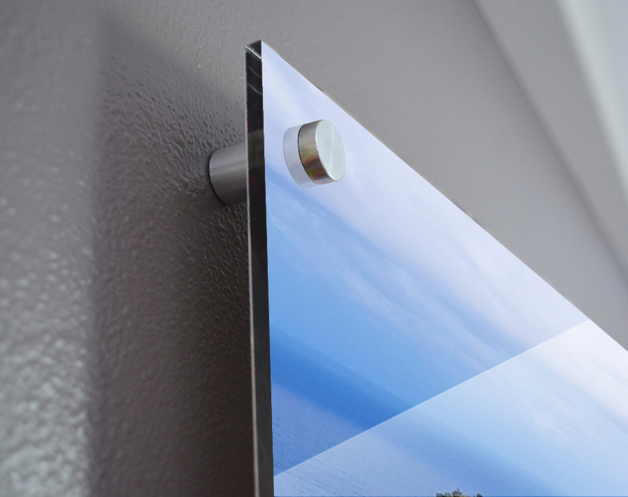 Printed to the edge - Ready to hang - provided with 4 premium polished aluminum stand off ( wall screws and mounting hardware provided ) We suggest a thicker 3/16" acrylic for any size over 42 inches to guarantee a straight acrylic, without curvature