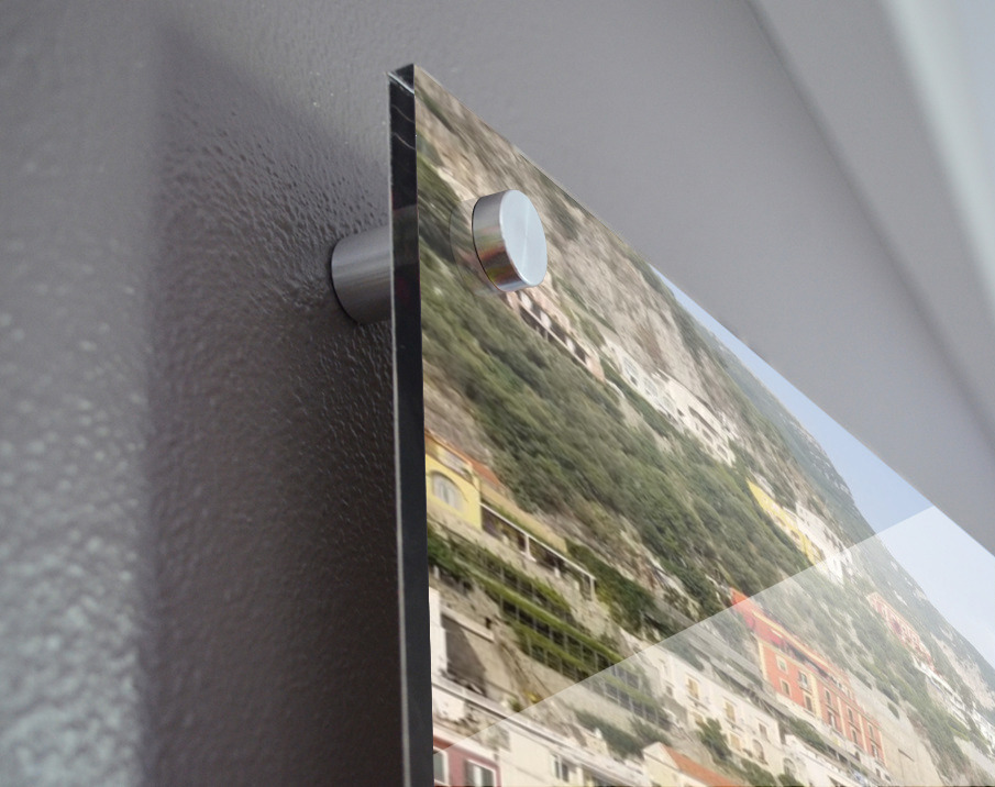 Printed to the edge - Ready to hang - provided with 4 premium polished aluminum stand off ( wall screws and mounting hardware provided ) We suggest a thicker 3/16" acrylic for any size over 42 inches to guarantee a straight acrylic, without curvature